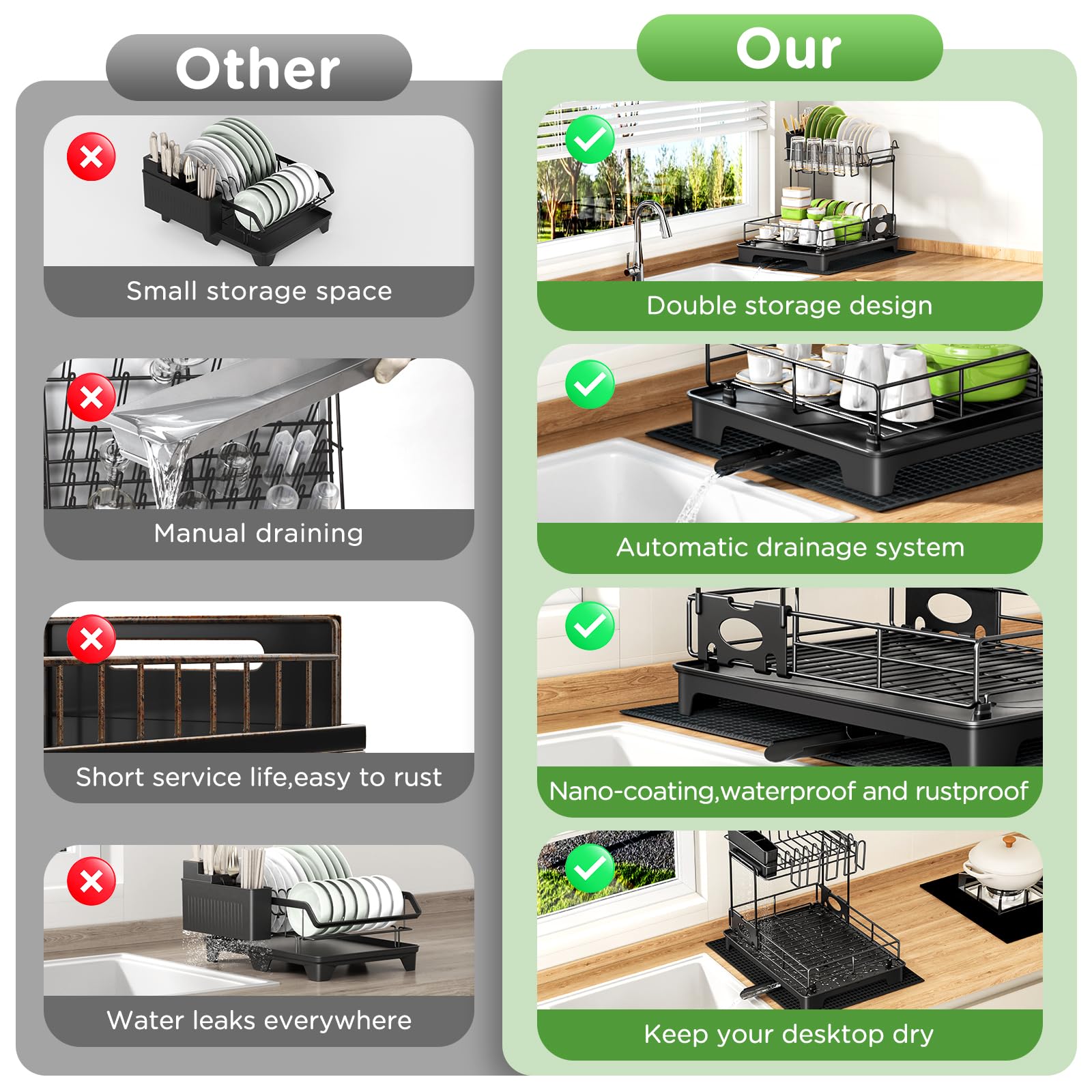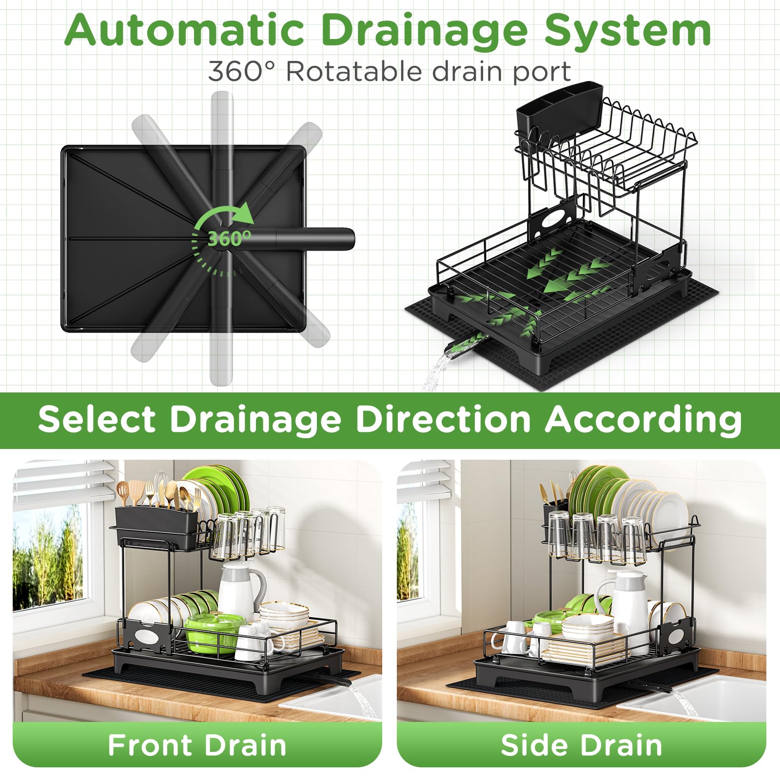 • 【Système d’égouttage automatique】Le système de drainage automatique de cette seche vaisselle de cuisine empêche l’eau de s’infiltrer dans le plan de travail et le maintient toujours sec. L’égouttoir avec sa surface inclinée et ses rainures de drainage évacue l’eau plus rapidement.Buse rotative à 360°, ajustez-la pour qu’elle s’adapte à votre évier et qu’elle fonctionne.