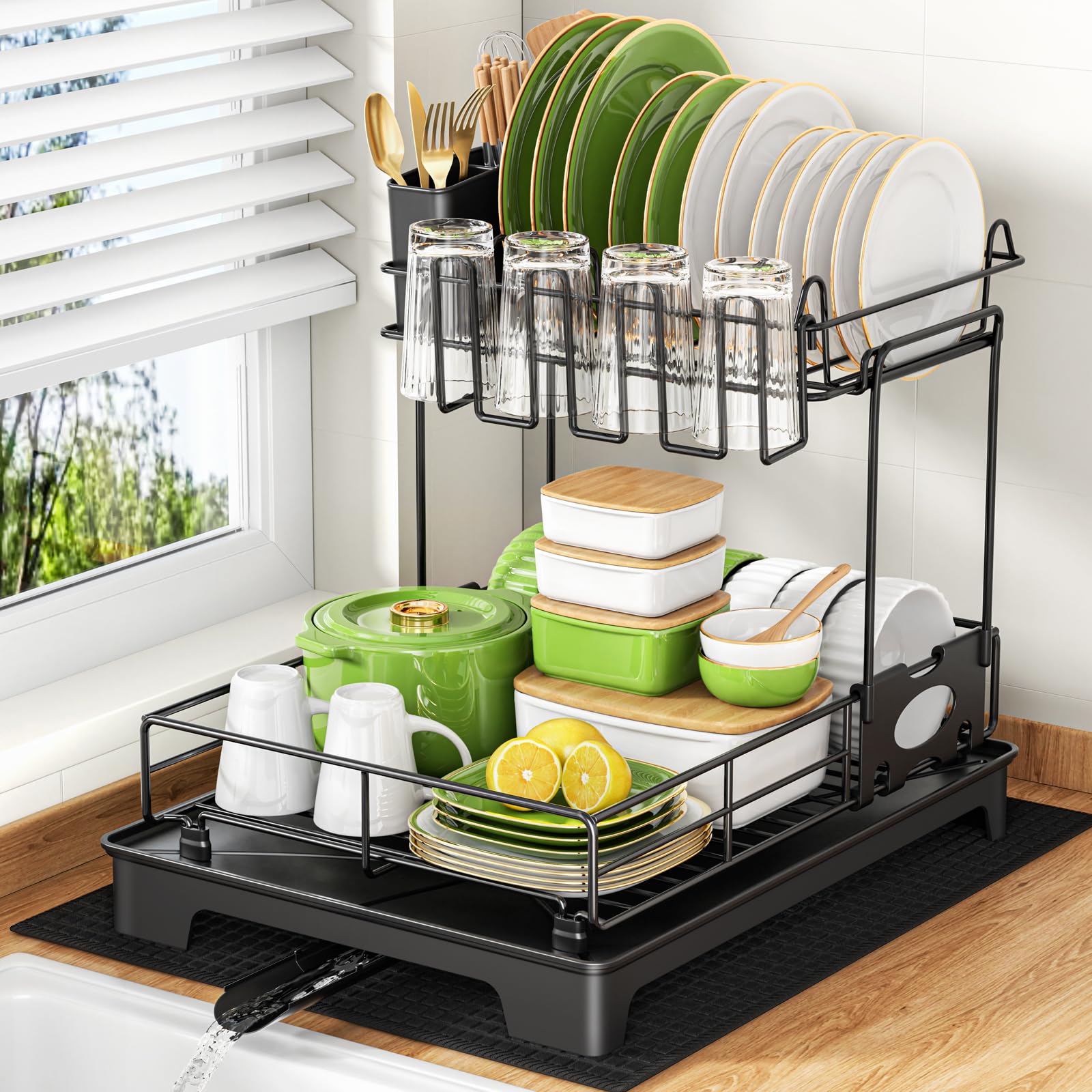 Afrcuisine Égouttoir Vaisselle INOX 2 Niveaux, Self-draining Porte Vaisselle Égouttoir avec Porte-gobelet & Porte-ustensiles & Tapis Absorbant pour Plans de Travail de Cuisine