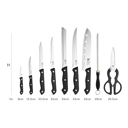 - SET DE COUTEAUX COMPLET : 1 c. de cuisinier, 1 c. à filets et 1 c. de boulanger (33cm chacun), 1 c. à désosser (25cm), 1 c. multiusage (23,5cm), 1 éplucheur (8cm), 1 aiguiseur (29cm), 6 c. à viande (12,5cm) et 1 paire de ciseaux (20,5cm).